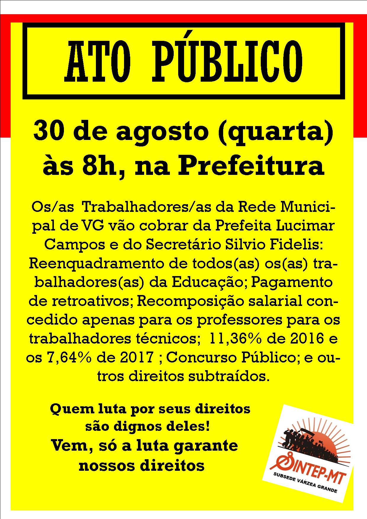 HomeCampanhasATO PÚBLICO - 30 DE AGOSTO Campanhas 23 de julho de 2017 Updated: 23 de julho de 2017 ATO PÚBLICO – 30 DE AGOSTO Share FacebookTwitterPinterestWhatsApp LEAVE A REPLY Cancel reply Comment: Please enter your comment! Name:* Please enter your name here Email:* You have entered an incorrect email address! Please enter your email address here Website: Save my name, email, and website in this browser for the next time I comment. Share FacebookTwitterPinterestWhatsApp Mais lidos Notícias Audiência com nova secretária da Educação garante avanços na pauta dos trabalhadores silvia - 8 de abril de 2026 Notícias COMUNICADO – Funcionamento no Feriado de Páscoa 1 de abril de 2026 Notícias NOTA DE PESAR 30 de março de 2026 Notícias SINTEP/VG COBRA IMPLEMENTAÇÃO IMEDIATA E ORGANIZA MOBILIZAÇÃO DA CATEGORIA 19 de março de 2026 Relacionados Notícias Audiência com nova secretária da Educação garante avanços na pauta dos trabalhadores 8 de abril de 2026 Notícias COMUNICADO – Funcionamento no Feriado de Páscoa 1 de abril de 2026 Notícias NOTA DE PESAR 30 de março de 2026 Notícias SINTEP/VG COBRA IMPLEMENTAÇÃO IMEDIATA E ORGANIZA MOBILIZAÇÃO DA CATEGORIA 19 de março de 2026 Notícias Nota de Pesar: Sintep/VG lamenta o falecimento da professora Kerly Patrícia da Silva Arruda 12 de março de 2026 LEAVE A REPLY Cancel reply Comment: Please enter your comment! Name:* Please enter your name here Email:* You have entered an incorrect email address! Please enter your email address here Website: Save my name, email, and website in this browser for the next time I comment.