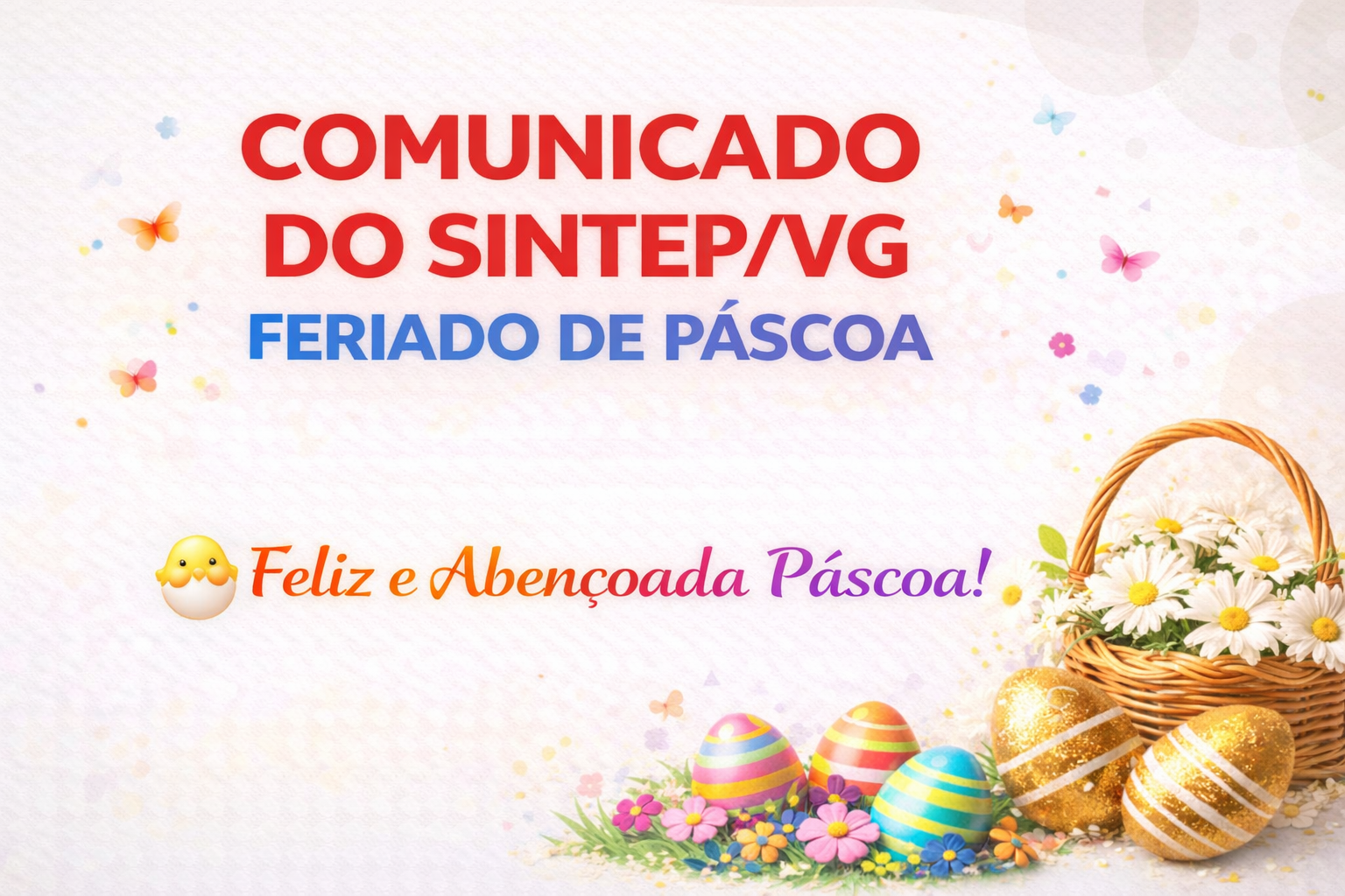 A Direção do SINTEP/VG aproveita a oportunidade para desejar aos trabalhadores e trabalhadoras da educação e seus familiares uma Feliz e Abençoada Páscoa , marcada pela renovação, esperança e solidariedade.