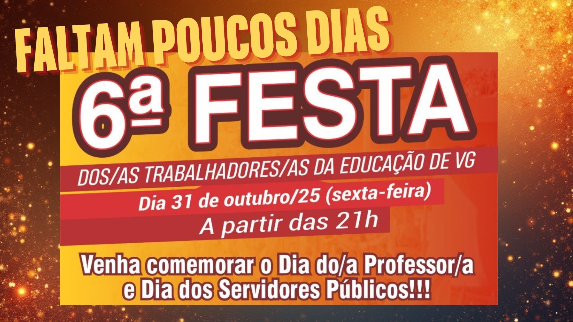 Faltam poucos dias para a tão aguardada 6ª Festa dos Trabalhadores da Educação de Várzea Grande, promovida pelo Sintep/MT, Subsede de VárzeaGrande, em celebração ao mês do servidor público e em reconhecimento ao papel essencial de cada educador e trabalhador da rede pública de ensino.