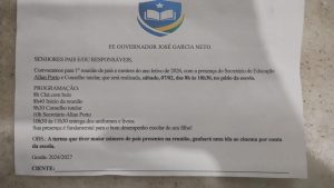 O Sindicato dos Trabalhadores no Ensino Público de Várzea Grande (SINTEP/VG) recebeu denúncia da comunidade escolar da Escola Governador José Garcia Neto acerca de convite encaminhado aos pais e responsáveis para reunião escolar com a presença anunciada do secretário de Educação, Allan Porto.